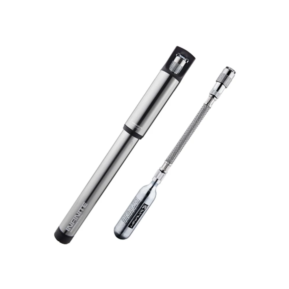 The Infinite-Apogee Road offers an all-in-one inflation solution for the rider who wants the instant power of CO2 as well controlled accuracy in a pump. It features a retractable steel mesh hose which connects to the pump or a CO2 cartridge.