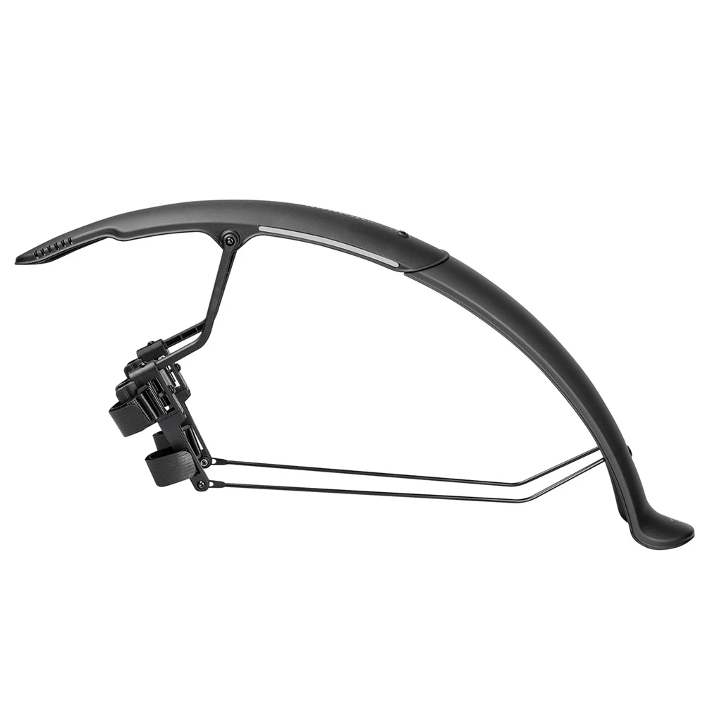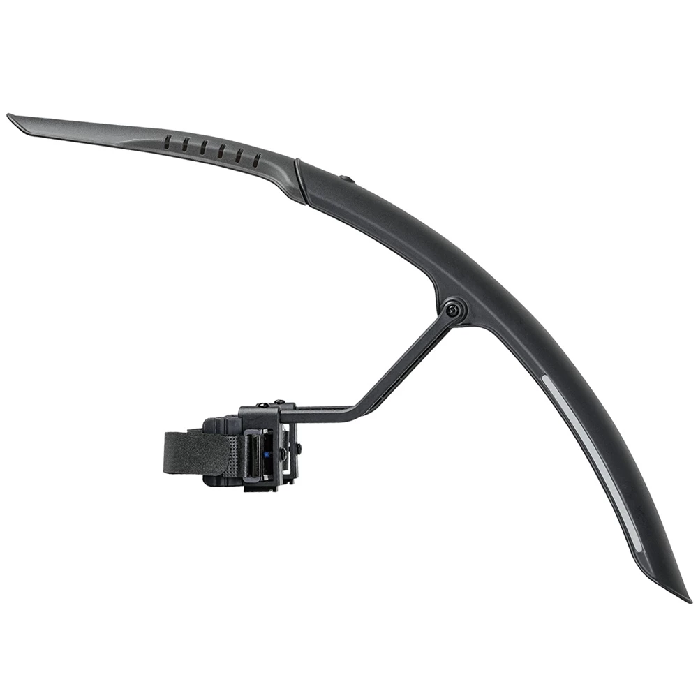 The perfect quick-mount, dual color front fender that attaches to gravel bike forks with hook and loop straps easily and securely. Adjustable struts provide a closer fit to the tire and excellent mud / spray protection while the highly polished underside helps prevent dirt buildup and aids in cleaning. Included 3M reflective decals provide safety at night.